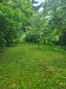 Az udvar füvesített, a hátsó részben gyümölcsfák vannak.