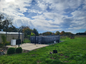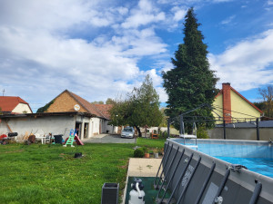 Az udvaron medence lett felállítva, betonozott aljzattal, kerti pavilonnal.